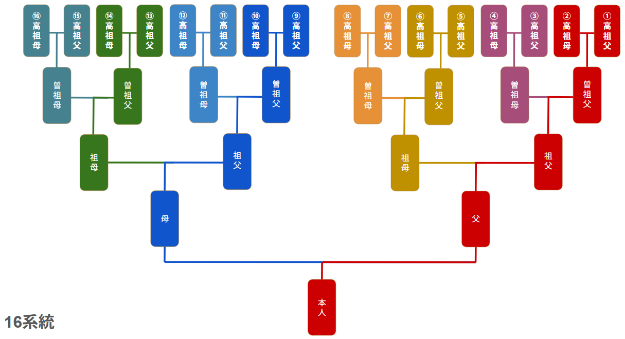 高祖父母にあたる16人全員、またはそれ以上の全系統を調べる。