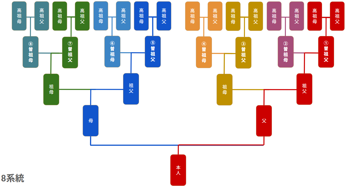 例)自分から8系統(曽祖父母まで含む)の場合