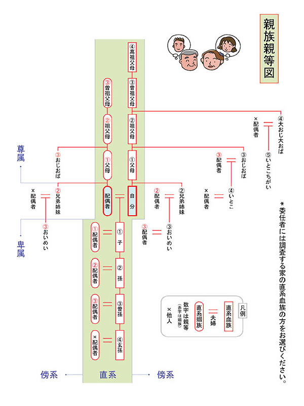 * 直系とは、自分から親子関係で続いている家族のことで、それに対して傍系とは、血はつながっているが、親子関係で結ばれていない人々のことを指します。