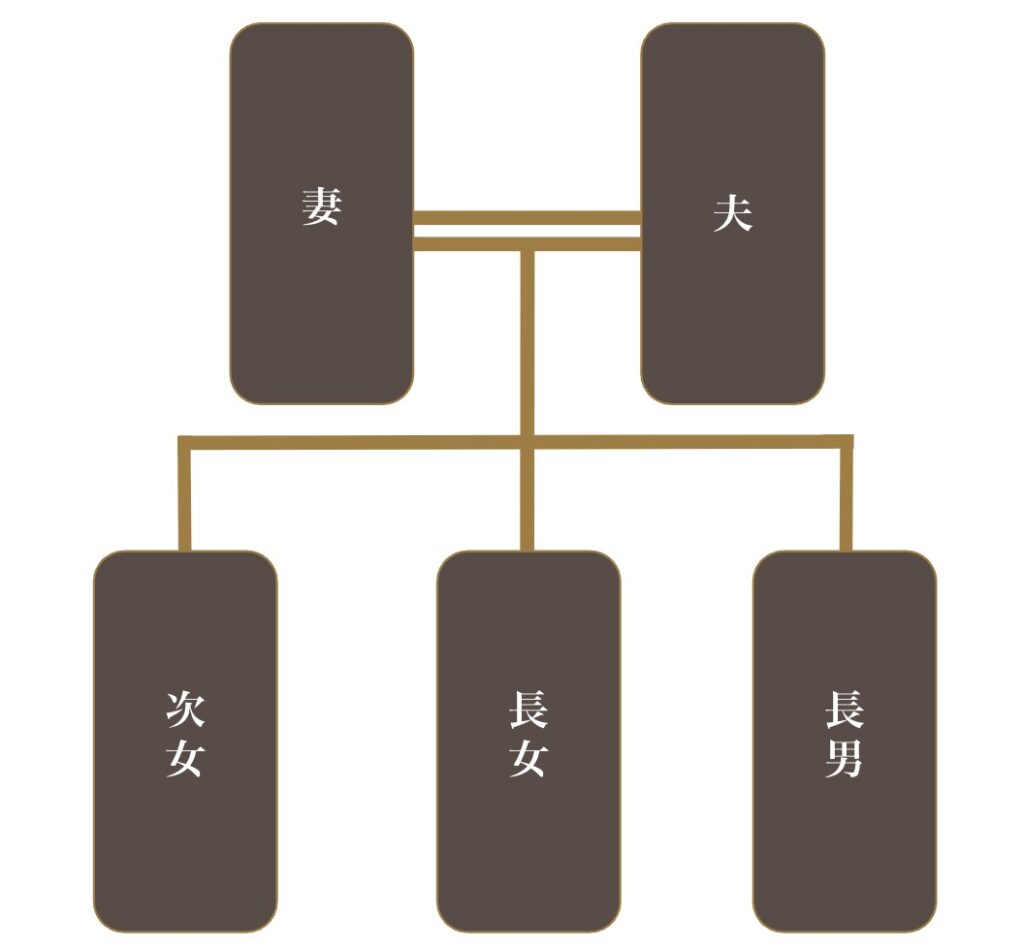 夫婦線から縦線を下に伸ばし、そこから子どもを結ぶのが基本形です。 兄弟姉妹は、同じ高さに並べて記入します。