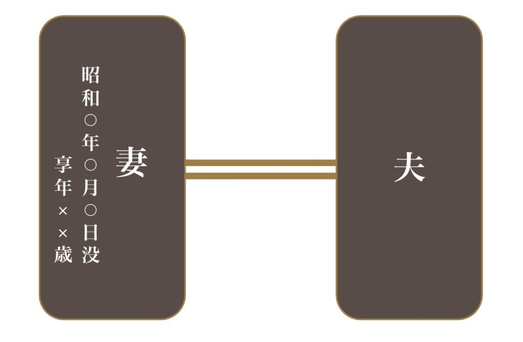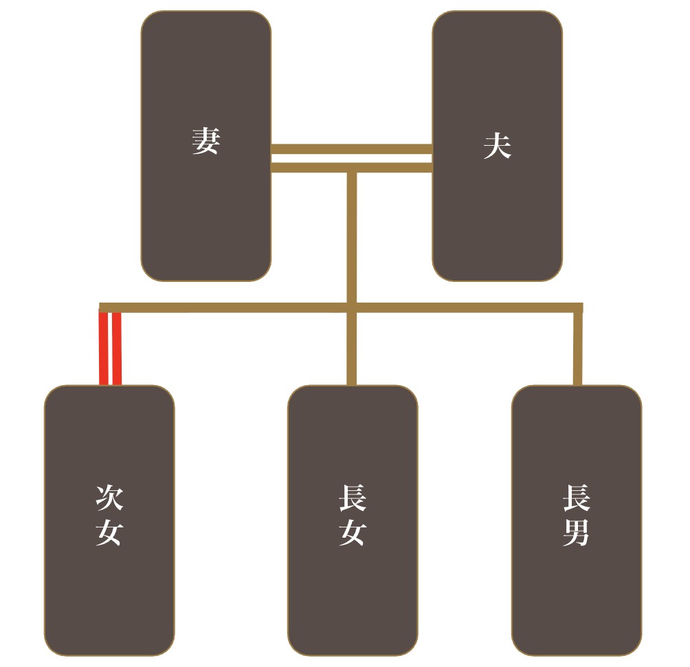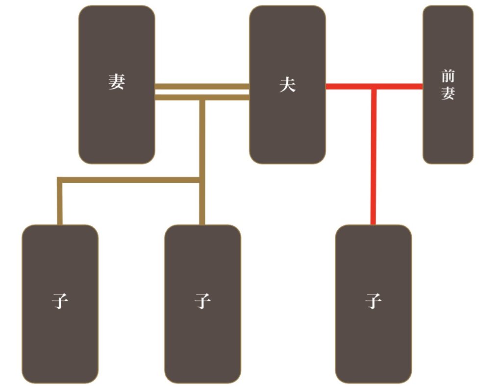 一人の男性、または女性が再婚した場合、前の配偶者と後の配偶者を記載しますが、右にに前妻、左に後妻を配置することが多いです。 また前妻(または前夫)との間に生まれた子どもと後妻(または後夫)との間に生まれた子どもを、どちらの配偶者との子かが分かるように明確に線で示します。