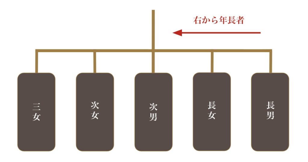 同じ両親から生まれた子どもは、同じ世代として横並びに配置します。 日本語の様式上、長子から順に右から左へと並べると見やすさが増します。